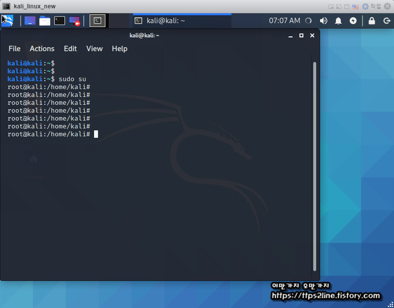 부팅이 끝나고 나면 아래와 같이 GUI화면을 확인 할 수 있고 상단 커맨트 창 선택 후 root 모드 로 들어가는 방법은