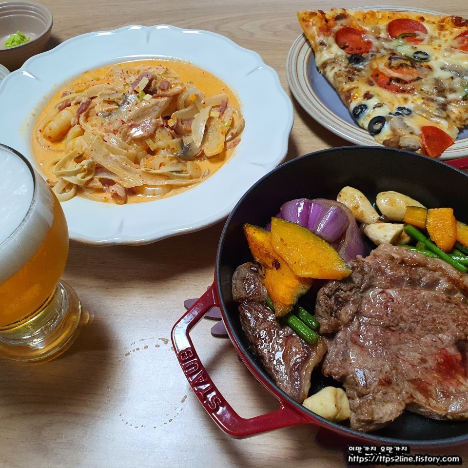 파스타와 스테이크 피자가 먹고 싶어 나가서 먹을까 하다가 집에서 한번 만들어 봤습니다. 나름 다이어트 중이었어서 면은 두부면으로 대체하여 파스타를 만들어 봤습니다. 스테이크는 직접 사서 해볼까 하다가 고기가 비싸서 실패하면 안 되기 때문에 피코크에서 나오는 밀 키트를 이용해봤습니다. 야채도 풍성하게 들어있고 굿 초이스였습니다. 그리고 소스로 고추냉이를 준비했는데 이 또한 탁월한 선택이었습니다. 여기서 시원한 맥주 한잔 천국이 따로 없더군요.
