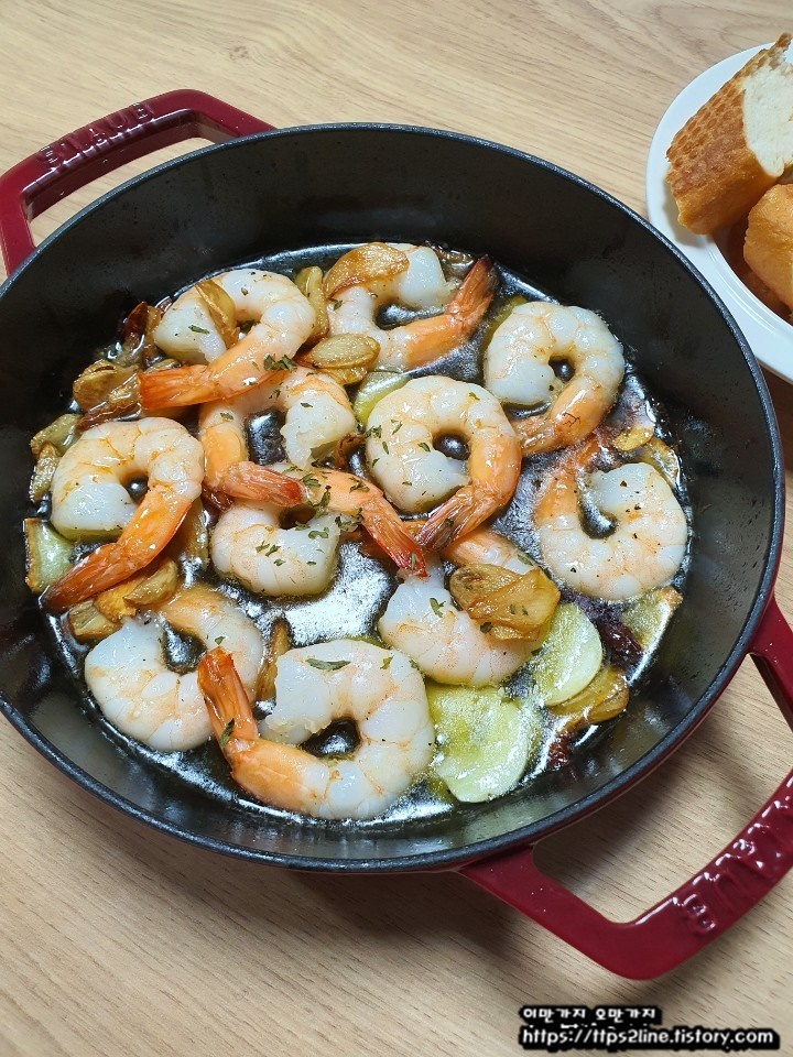 집에서 아주 간편하게 유럽 음식을 느낄 수 있는 감바스입니다. 스타우브(STAUB) 주물 그릇 때문에 더욱 맛있게 해 먹을 수 있었습니다. 그냥 프라이팬에도 만들어 서 먹어봤으나 아래 사진과 같은 느낌이 나지 않더라고요. 다시 한번 그릇의 중요성을 느낍니다.