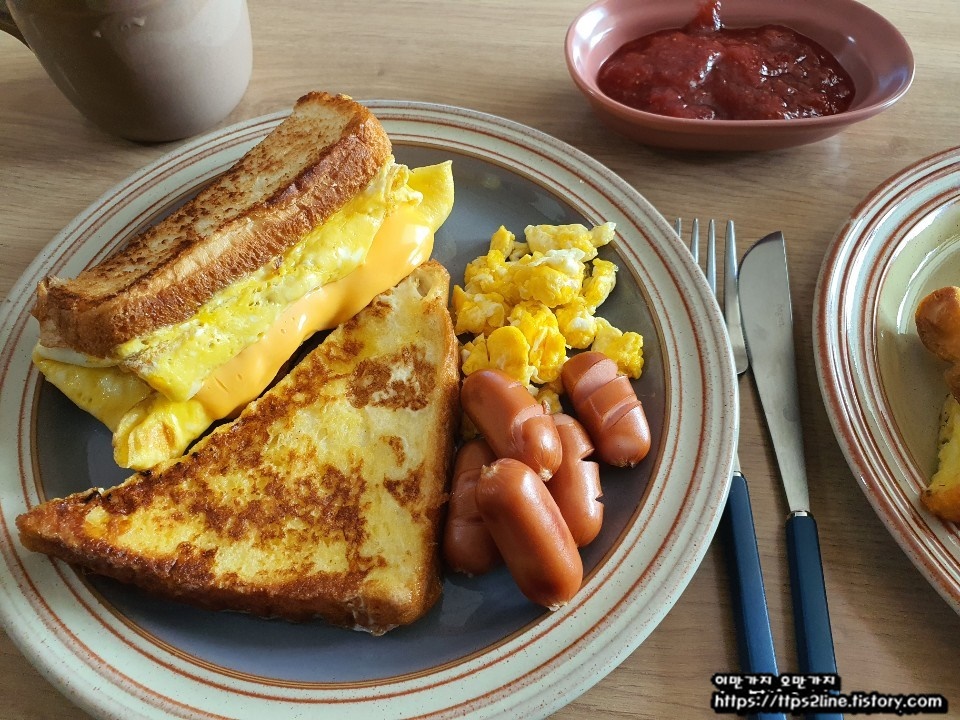 빵 사이에 흘러나오는 치즈가 보이시나요. 말이 필요 없습니다. 그냥 한번 만들어서 드셔 보세요~^^ 백종원 레시피였던 거 같습니다. 토스트만으로 먼가 허전하다면 간단히 스크램블과 미니소시지로 그릇을 채워보세요.