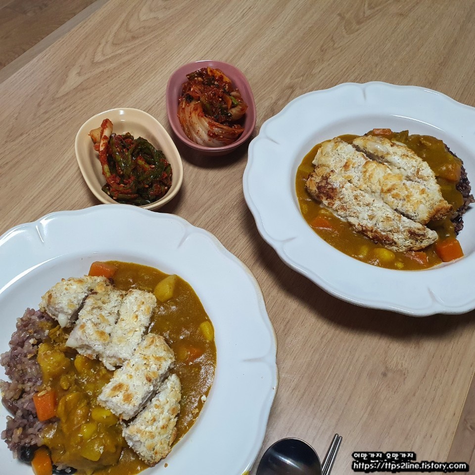 에어프라이 구입 후 만들어 보았던 돈가스 카레덮밥입니다. 기름기가 아주 쫙 빠져서 돈가스가 메말라 보이지만 맛은 괜찮았습니다. 에어프라이어가 생겨서 좀 더 편하게 음식을 해 먹을 수 있답니다. 웬만하면 에어프라이어로 모든 게 되더군요 카레와 돈가스가 먹고 싶은 땐 따로따로 먹는 것보다 덮밥 형식으로 먹는 게 탁월한 선택 같습니다.