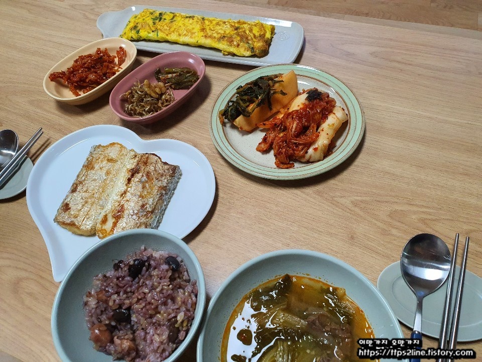 제가 생선구이를 참 좋아하는데요 그중에서도 갈치를 최고로 생각합니다. 비싸서 자주 사 먹지는 못하지만 가끔 먹는 날이면 아주 행복하답니다.^^ 그리고 계란말이. 처음 시도할 때는 둘이서 해야 했지만 이제는 혼자서도 잘 말 수 있답니다. 반찬이 먹을 만하게 없다? 그러면 바로 계란말이 만들어서 든든한 한 끼를 해결할 수 있답니다.