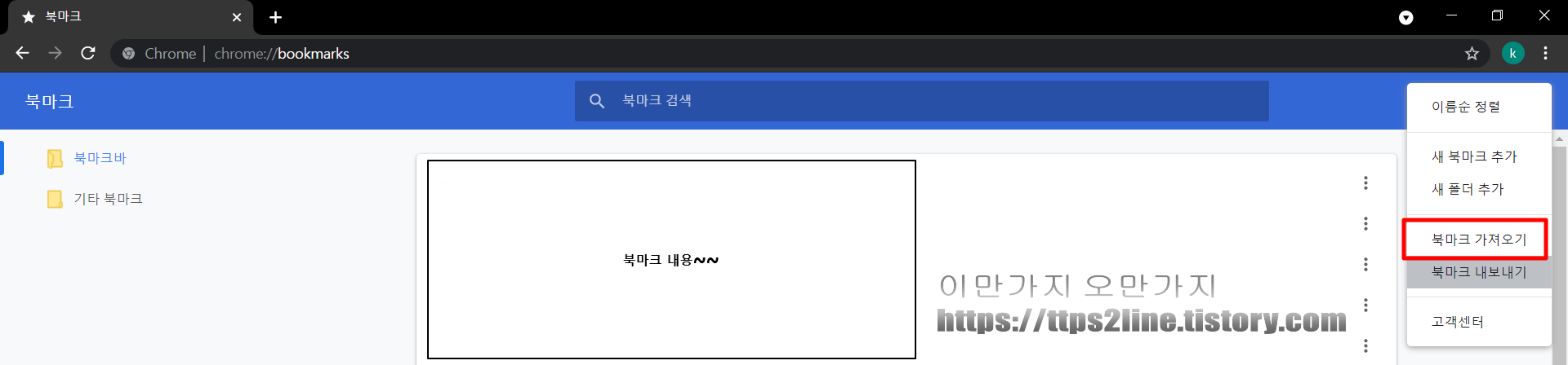 백업된 북마크를 가져오는 방법도 아주 간단합니다. 크롬(Chrome) 브라우저 상단 우측 메뉴 > 북마크 > 북마크 관리자를 클릭합니다. 북마크 관리자 페이지에서 우측 상단에... 버튼을 클릭하면 메뉴가 나옵니다.