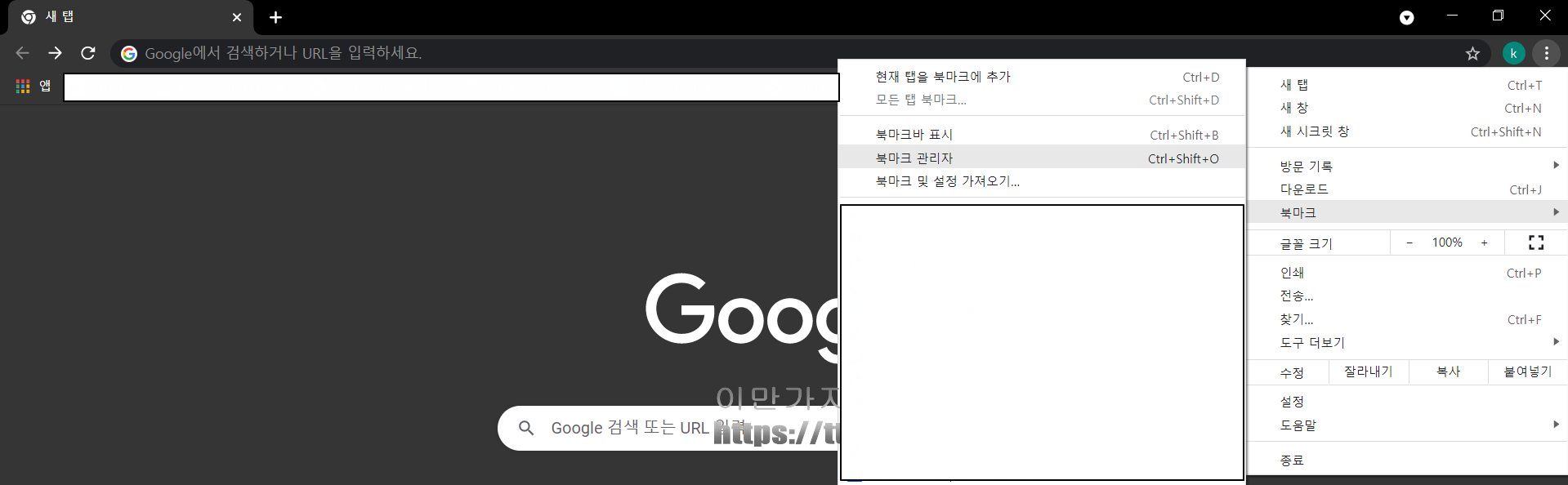크롬(Chrome) 브라우저 상단 우측 메뉴 > 북마크 > 북마크 관리자를 클릭합니다.