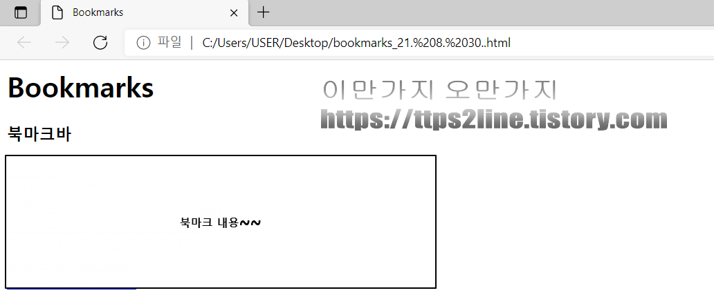 그다음 북마크 내보내기를 클릭하면 저장된 북마크가 html 파일로 저장되는 것을 확인할 수 있습니다.