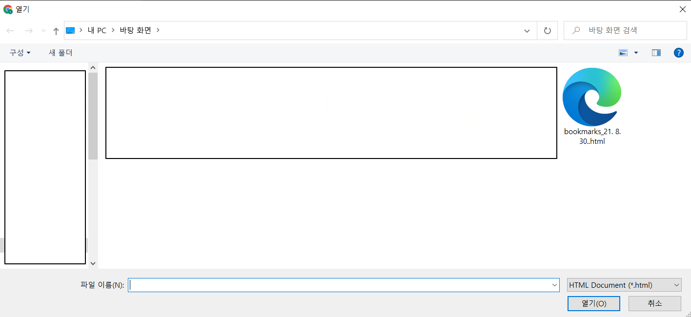 그다음 북마크 가져오기를 클릭하면 파일을 불러올 수 있는 창이 열리고 저장했던 북마크 파일 xxx.html 파일을 선택하여 불러옵니다.