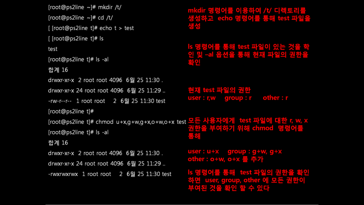 - 파일이나 디렉토리에 대한 사용자의 허가정도를 나타낸다