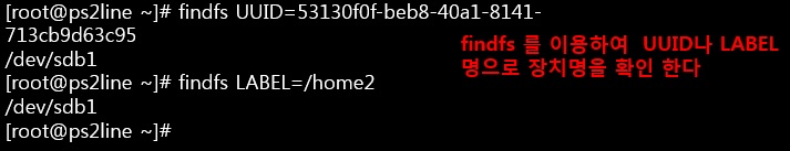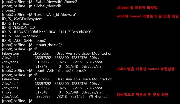 리눅스 설치시에 생성되는 파티션의 경우 자동으로 마운트되는 디렉토리 이름을 라벨명으로 할당한다. 사용자가 임의로 할당하는 경우 'abc' '123' 등과 같이 라벨명을 지정해도되지만 보통 디폴트 명명 규칙에 따라 마운트될 디렉토리 명으로 할당한다. 그냥디바이스명을 쓰는것이 좋다. 마운트를 라벨명으로 할 수 있다.