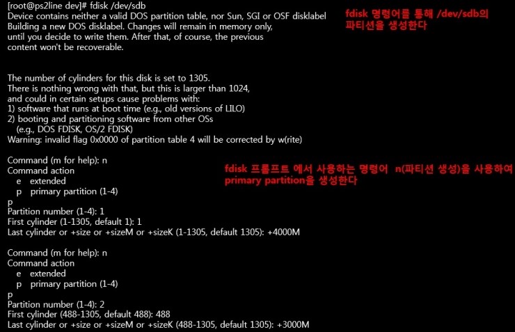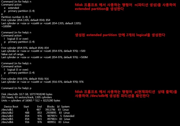. n : 파티션 생성(리눅스 네이티브 파티션만 만들 수 있음)