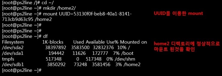 . UUID는 파티션의 고유 정보로 디스크의 위치가 바뀌어도 동일하게 유지된다.