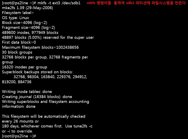 - fdisk(파티션 만들기) → mkfs(파일시스템 생성(포멧)) → mount(디렉토리에 마운트)